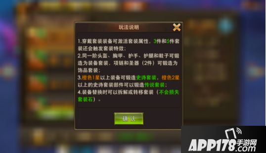 2.玩法说明:套装主要分为装备套装和饰品套装,橙色1星以上可以锻造史诗套装,橙色2星以上的史诗套装不见可以锻造传说套装,当套装集齐到一定的件数会触发套装特效~