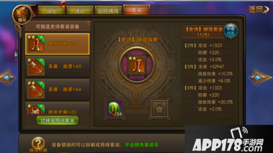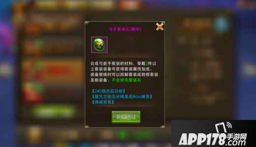 3.合成套装所需材料为套装石和强化套装石,套装石可以通过世界BOSS和商城获得,强化套装石暂时只能通过世界Boss获得