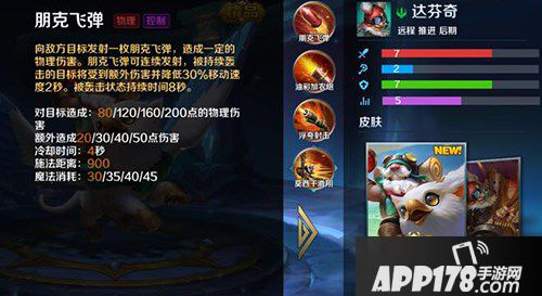 一技能朋克飞弹,对目标造成80/120/160/200物理伤害。8秒内命中同一目标2次可减速30%持续2秒并且每次普攻造成额外物理伤害,冷却时间4秒,耗蓝30/35/40/45,施法距离900