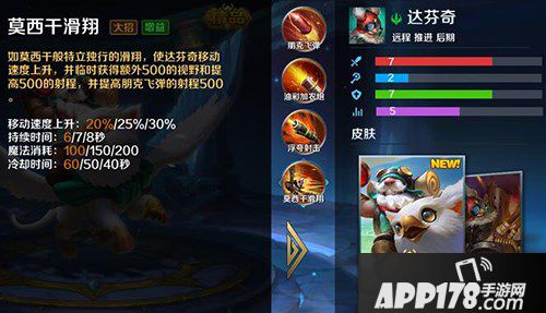 终极技能莫西干滑翔,开启后增加20%/25%/30%移速,持续6/7/8秒,冷却时间60/50/40秒。开启后增加达芬奇500射程,并且提升一技能500射程。