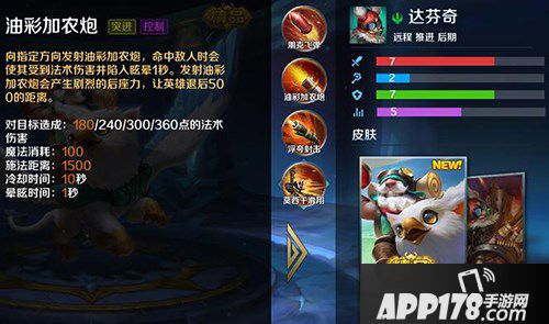 二技能油彩加农炮,对命中的敌人造成满级300法术伤害并晕眩1秒,冷却10秒,耗蓝100.