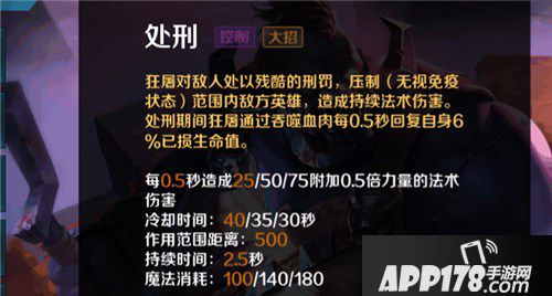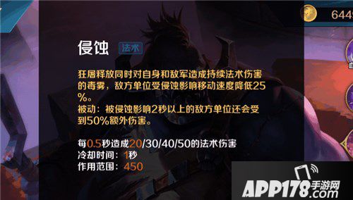 技能解析:在该技能的范围内,释放毒气对周围的敌人造成持续的法术伤害和减速,且敌方英雄在该技能的范围内两秒以上会受到额外的法术伤害。