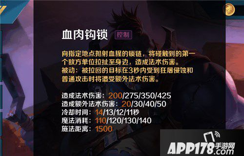 技能解析:向指定方向释放钩锁,将敌人拉到自己的身旁。而被拉过来的敌人在受到自己的普通攻击和二技能会有额外的伤害。