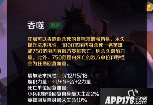 技能解析:敌方英雄在屠夫750码的范围内死亡会永久的增加一定的力量,如果在1800码的范围内,击杀敌方英雄也能给自己带来一定的力量加成。两者区别在与一个是队友击杀和自己击杀范围不同。且该技能还有一个效果就是在750码范围内的敌人或小兵和野怪死亡会带给自己10%和2%的生命恢复。
