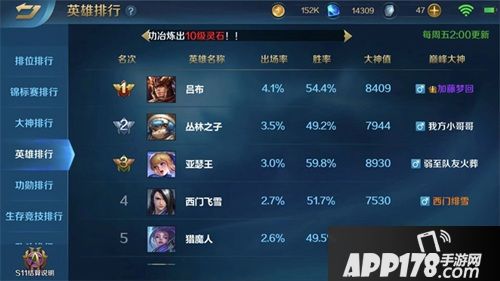 一瞬间上百款英雄任你挑,选择太多不知道该练谁?打开排行榜—英雄排行,就可以看到近期所有英雄的全服战斗数据,版本强弱一览无余,绝对能帮你选到最合适的试玩英雄!