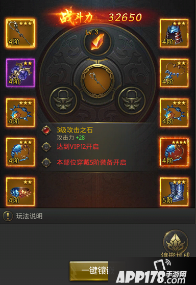 每件装备有三个宝石孔,达到相应条件后将逐一开启。不同装备有固定可镶嵌的宝石,例如武器镶嵌的是攻击之石,衣服镶嵌的是生命之石。同时人物累计宝石等级每10级可获得加成,各项属性和战力将获得大幅提升。而宝石等级可以通过宝石合成提升,每3个宝石即可合成获得更高级的宝石!