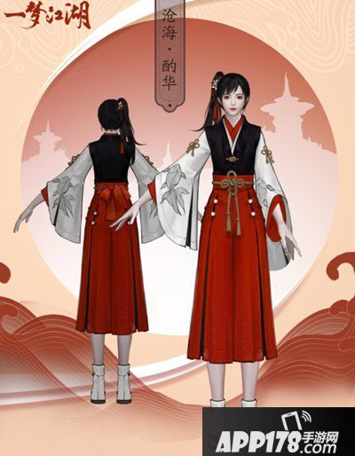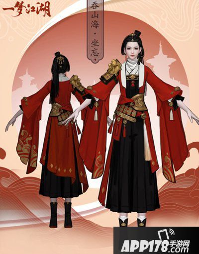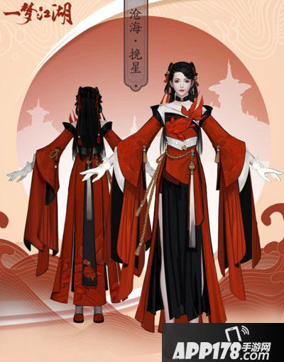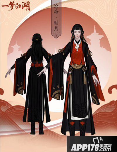时月套以黑红配色,黑色占了大篇幅,气场强大、稳重。胸前的锦鲤绣样保留了沧海门派的特色,袖子上还可以看见部分星盘的图案,可以说是别出心裁的精巧设计。