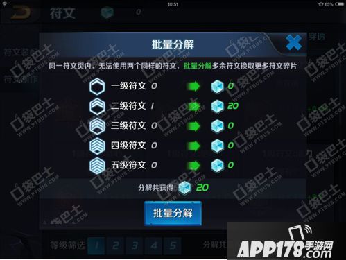 首先,点击你已有的不需要的符文,单后点击分解,1级符文可以得到10个符文碎片,二级符文可以得到20个碎片,三级符文可以得到80个碎片,四级符文可以得到320个碎片,五级符文可以得到800个碎片。