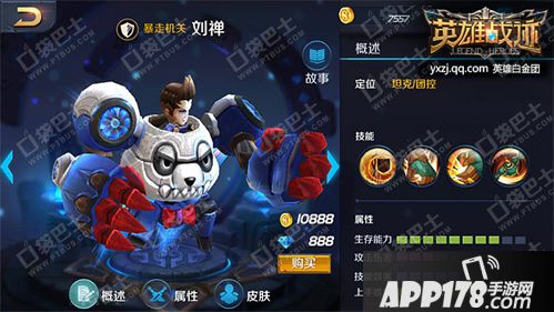 刘禅在三国中是一个比较悲剧的人物,但是在游戏中,他是著名的蓉城小霸王,师从诸葛亮。请求师父为自己制造了新一代木牛流马机关坐骑,渴望能在战场上横行一把。由于他对防护工作的重视,他将打造精良的机器装甲带入了战场,利用高科技的力量上阵杀敌。磁力屏障是刘禅的被动技能,让他受到小兵和野怪的伤害降低;主动技能小霸王护盾可让刘禅开启护盾向前发起冲锋,吸收伤害同时提升自身移动速度,并强化下一次普通攻击,造成物理伤害并短暂击飞,是拦截敌将和逃跑的必备技能;机关魔爪是刘禅伸出魔爪攻击前方区域敌人,造成物理伤害并眩晕,也是一个强力的控制技能;暴走熊猫作为刘禅的主动大招,可让刘禅告诉旋转,并持续对周围敌人造成物理伤害,配合小霸王护盾可以对敌方群体造成成吨的伤害。刘禅是一个攻守兼备的英雄,多控制、有护盾让刘禅的坦克TOP3名至实归。