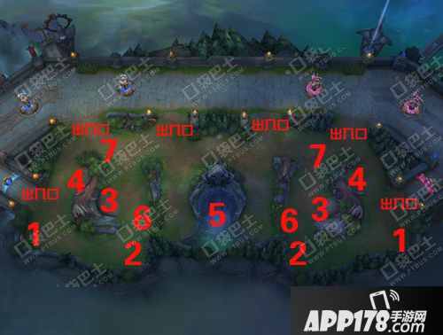 野区除了野怪,还有个重要的组成部分6和7——草丛。我们能利用草丛消失视野的特性来埋伏对手,甚至入侵对方野区,抢占更多的资源。