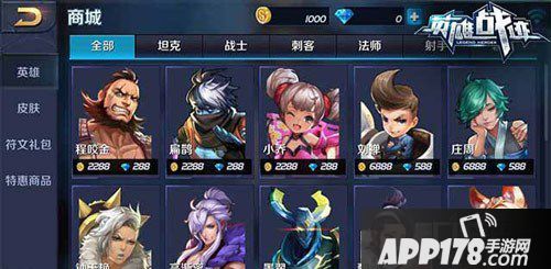商城:商城界面中卫玩家提供了各种英雄的购买方式,玩家可以通过金币或者钻石的方式来获得这些英雄的使用权,同时还有匹配英雄的酷炫皮肤,高品质的符文礼包,以及金币和经验获取加成的特惠商品。