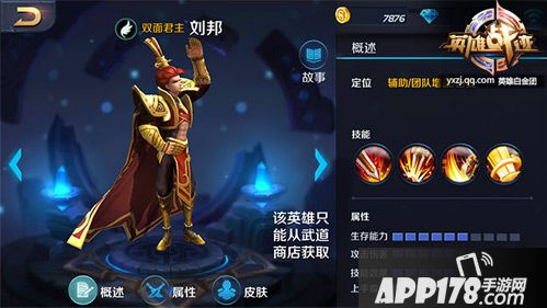 刘邦是一个团队的强力回复型辅助英雄,他的获取方式比较独特,只能通过武道商店购买获取。其被动技能可以让他自己恢复生命值保持续航,主动技能偏重于突进和减速敌方,大招可以对范围友军进行清除负面效果和增加移速、免伤效果,是个冲锋型的辅助英雄。他的大招持续时间较长,并且效果较为出色,可以很好的为团队建立优势。