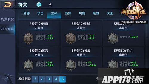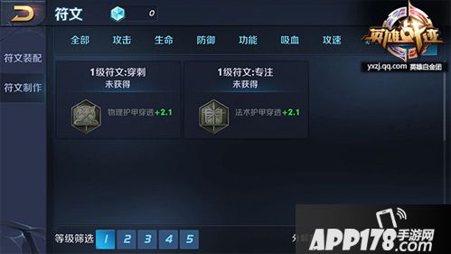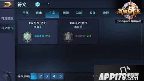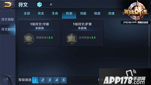 符文系统中的符文是有等级划分的,低级符文只有一个属性,同时数值较低,高级符文拥有两个属性,属性增加较多。符文等级共分为五个等级,其中一级最低,五级最高。坦克类英雄的符文也是可以通过制作高级符文来提升的。坦克类的通用符文随着玩家获得的金币和等级的提升,可以分解掉低级无关的符文,收集制作符文所需要的材料,通过合成来获取高级符文,全面提升坦克类通用符文的威力。由于高级符文需要的材料较多,玩家可以一个一个符文缓慢置换,不要一次全部熔解己方符文。