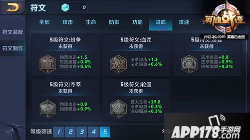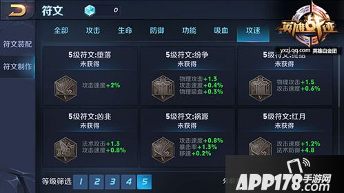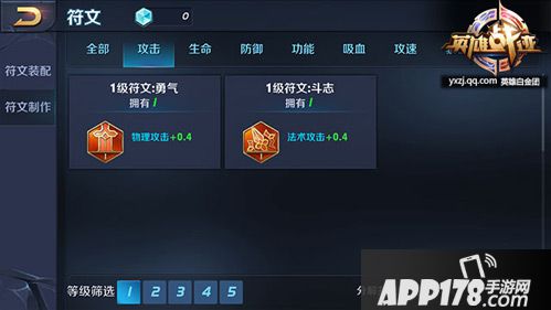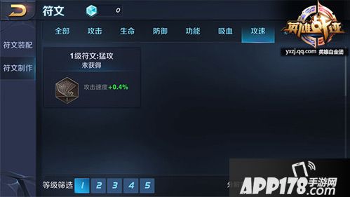 符文系统中的符文是有等级划分的,低级符文只有一个属性,同时数值较低,高级符文拥有两个属性,属性增加较多。符文等级共分为五个等级,其中一级最低,五级最高。坦克类英雄的符文也是可以通过制作高级符文来提升的。1-2级的符文都是增加1个属性的,从3级符文开始,符文附加给玩家多个属性。对于战士类英雄而言,符文所带来的攻击和攻速等加成非常可观。在玩家等级未满之前,符文页是随着等级的提升慢慢开启的,玩家在选择镶嵌符文的时候,推荐的镶嵌顺序是:攻击、攻速、穿透、吸血、功能、暴击。在游戏初期玩家收集符文速度较慢,前期可以按照推荐的镶嵌顺序镶嵌低级符文,随着玩家对游戏的深入体验,慢慢可以逐渐升级符文,最后更换到较为高级的五级符文,让战士类的符文加成更有威力。推荐的五级符文是:增加物理攻击和物理护甲穿透的异变、增加物理攻击、攻击速度、吸血的纷争、增加法术攻击、法术吸血、冷却缩减的贪婪,增加攻击速度、暴击率、移速的祸源,增加法术攻击和法术护甲穿透的梦魇。玩家可以根据自己的实际需要去搭配自己的战士类的符文。