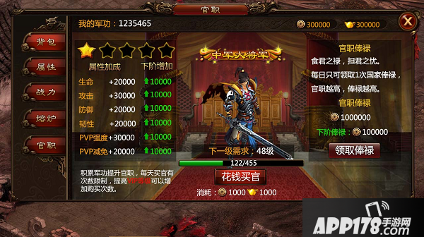 官职是游戏世界中地位的象征,可以通过消耗军功来在官职界面内升级官职,也可以通过花钱买官提高官职。官职会赋予角色属性的加成,玩家每日还可以领取一次俸禄奖励。
