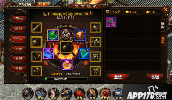已镶嵌的宝石可以通过吞噬玉髓和同类型的宝石提升宝石等级。