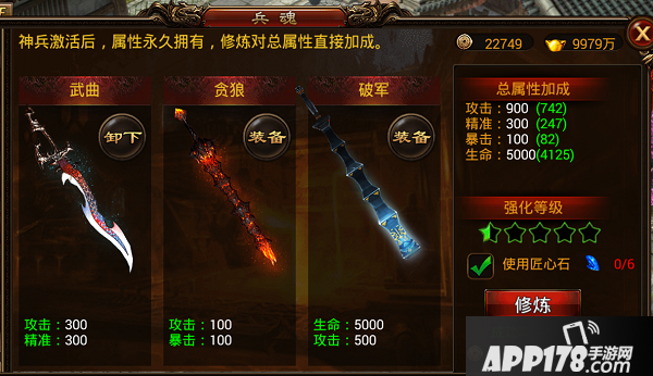 2.兵魂修炼会因为失败而掉级,所以当修炼等级高时,需要使用匠心石来保护兵魂不会掉级,产生不必要的陨石损失;