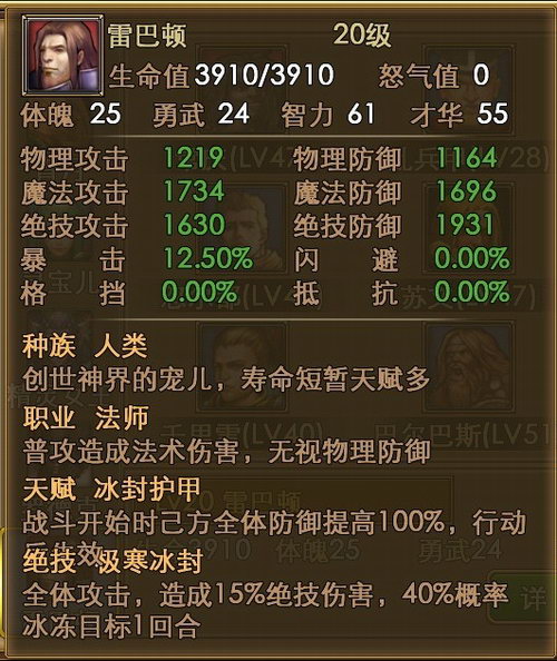值得注意的是雷巴顿天赋技能:冰封护甲的效果“在行动后失效”是指每个佣兵的分别行动后失效,是破先手群攻(咆哮、怒吼、地动、震地波、冰封千里等)打防守反击的必备佣兵,而且先手也有着保护一号位以后佣兵的优势,强烈建议有能力的童鞋入手并且大力培养!