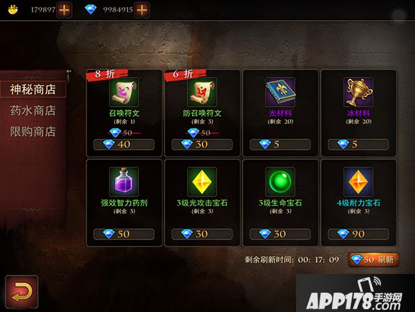 商城分为神秘商店,药水商店和限时商店三种,出售各种必需的材料宝贝。