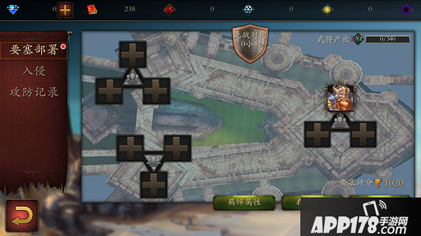 最多可部署九名武将来抵御他人的入侵,部署后的武将会生产一定数量的经验(武将等级越高,经验丹产出速率越快),武将产出的经验首先存放在要塞产出容器中。