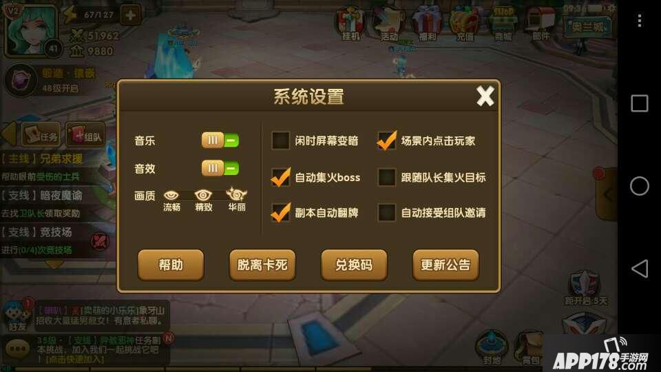 对了 有些玩家会觉得游戏时屏幕变暗 怎么样都不能调又或者是觉得有些卡 大家都可以点左上角角色头像 ,进去设置页面 ,把闲时游戏变暗功能关闭,就不会变暗了。 觉得卡的朋友们可以调一下画质哦