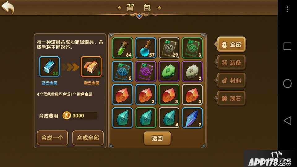 不记得了)。不用的装备都可以分解掉 再把材料都合成橙色的 紫色蓝色都没用 橙色装备才有用 性价比高推荐大家只合成40级以上的橙装 暗夜魔域,经验药水,用来镶嵌的宝石都可以合成~