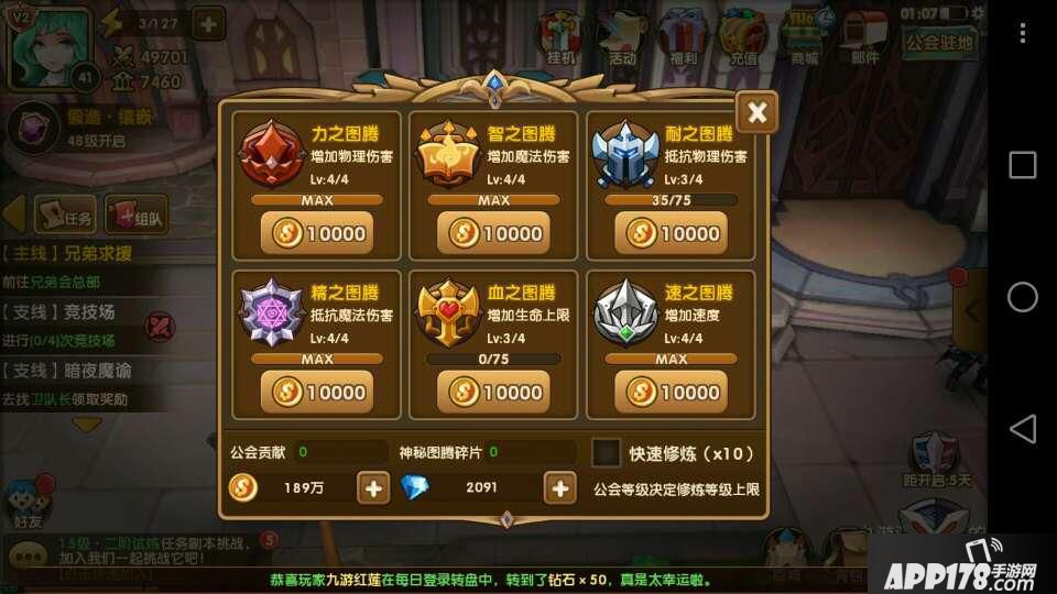 加入一个活跃的工会也很有必要(我在兄弟会的APP178手游浮生)许多事情副本都可以和工会朋友一起组队做 有加成哦~而且工会地图内 左上角有一个公会修炼使 点他可以修炼 。有很多加成属性~ 需要消耗贡献值和一定的金币。