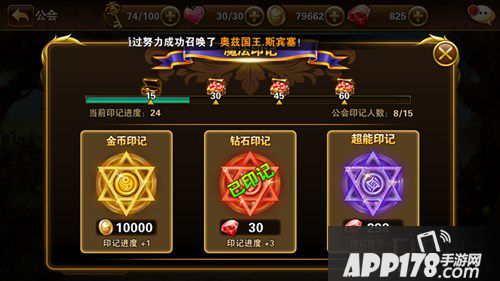 在公会每日需上交一次印记,印记又分三种:金币印记,钻石印记,超能印记。每日只能印记一次,达到一定进度可以获得不同的奖励。
