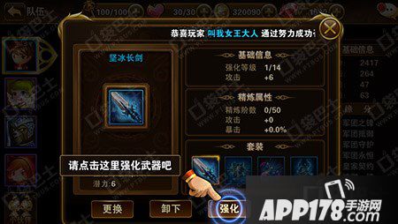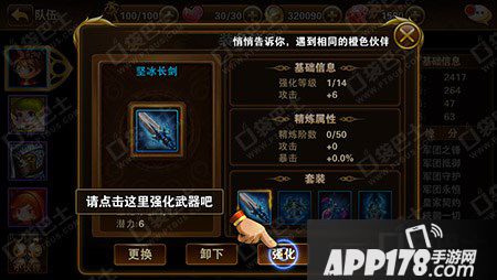 首先进入游戏界面的队伍,然后选择自己角色,选择要强化的装备,如下图所示我们要强化武器的话,点击要强化的装备就会显示下图。