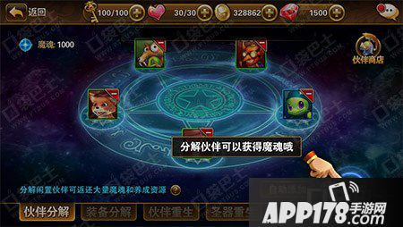 然后就会如下图所示,可以手动添加不要的伙伴,也可以选择自动添加,这样选择确定要分解的伙伴后,点击后面的分解,这样伙伴就分解成功了。分解成功后会获得魔魂和金币。