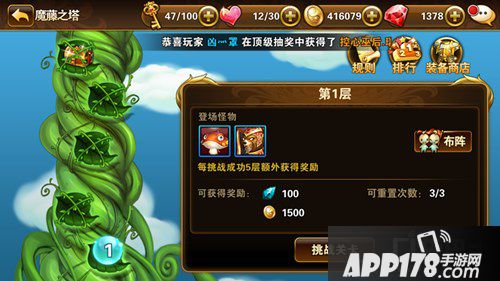 3、魔藤之塔共有100层,从1层开始,消灭当前层数才能进下一层。