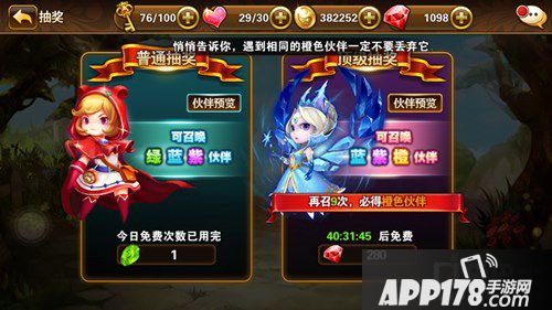 顶级抽奖:获得伙伴的星级会更高,但是需要耗费钻石280,推荐土豪使用!10抽必获橙色伙伴!