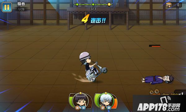 群体羁绊触发:新八吐槽,如果敌人倒地即可银时开车撞人,然后神乐接上!3人满怒气情况25连击。