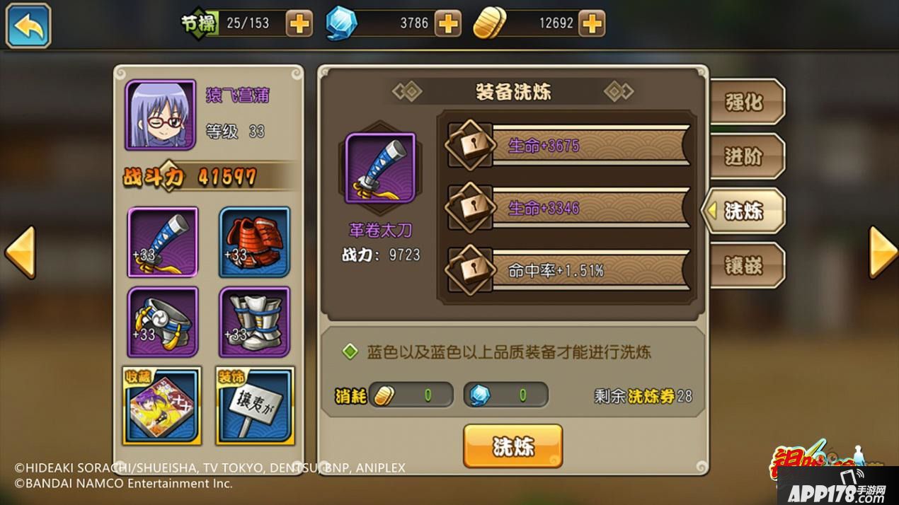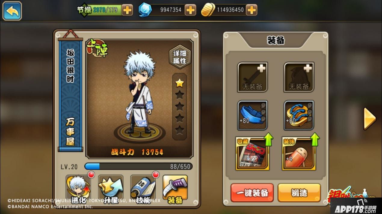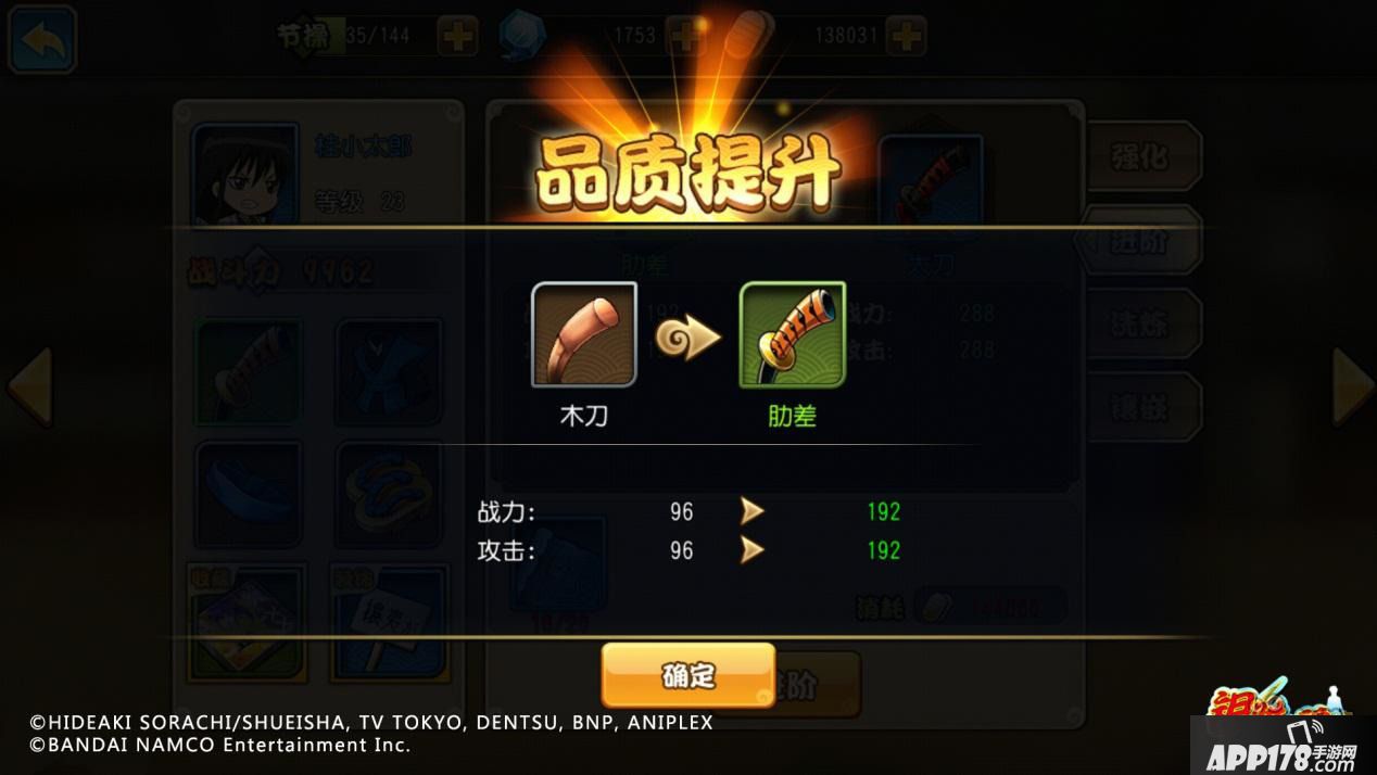 装备进阶是被玩家吐槽最多的功能之一,因为它只需要消耗一些设计图,就可以使羽织、木刀等看起来非常简陋的低阶装备,华丽变身成为大铠、太刀等高级神器,简直是屌丝变身高帅富,虽然不知道是什么原理,但不明觉厉。而饰品方面则更是槽点爆棚,什么阿姆斯特朗回旋加速喷气式阿姆斯特朗炮、“justwe”、寺门通“——哔——”歌曲CD等等,各种奇怪的东西真的能当饰品吗?