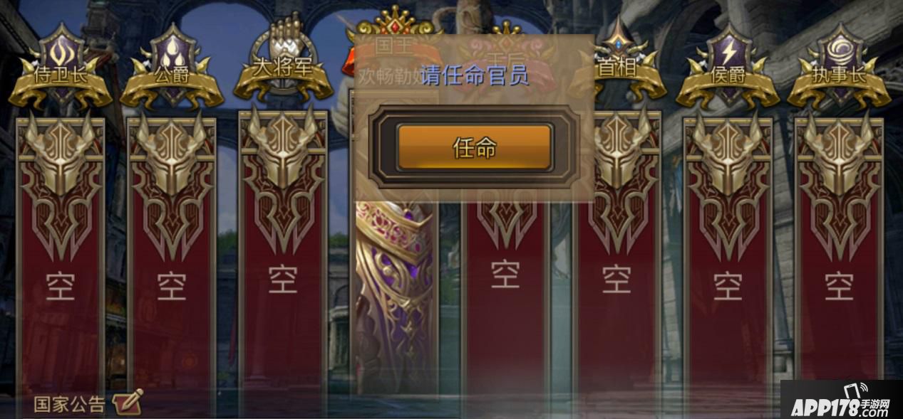 每个国家都会有一个国王,而这个国王就是公会排行榜上排行第一的公会会长。排行榜每天18:00会自动更新一次,只有最强者才能长久统治国家。