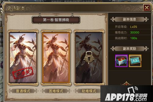史诗副本以章节形式展现,每一卷都分为三种难度,难度越高关卡中的BOSS就越多,而通关的时间是有限的,因此难度主要在于时限。通关后可以获得大量经验和神灵卡牌,但关卡只能完成一次,不可重复刷经验。