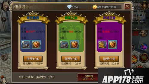 4.佣兵通告:每天可完成15次通告任务。进入之后会发现界面包含三个任务栏,都能提供经验值。接受任务后可以安心挂机等待完成时间,也可以花费银币瞬间完成,鉴于性价比超高,推荐大家用银币秒杀时间。由于每天完成次数有限,右下角又可以免费刷新5次,因此建议大家充分利用,刷新次数之内尽量挑选经验最多的橙色经验盒。这样不用一刀一枪,每天海量经验就能赚得盆满钵满。