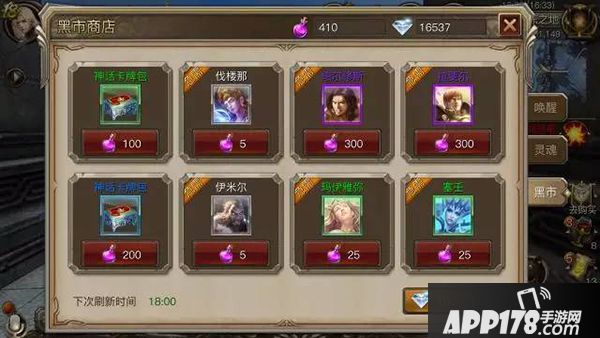 黑市在诸神试炼中完成任务可获得灵魂粉末,在黑市中可使用灵魂粉末兑换相应的卡牌。