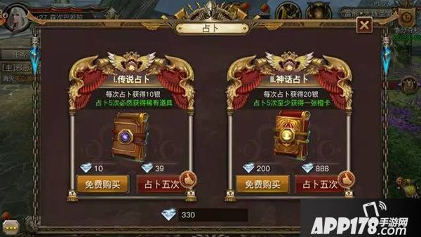 神灵获取神灵可通过占卜、诸神试炼、黑市、神灵分解4种途径获得。占卜每位玩家每天拥有一次免费神话占卜的机会,每次神话占卜都有机会获得橙品神灵卡牌一张。