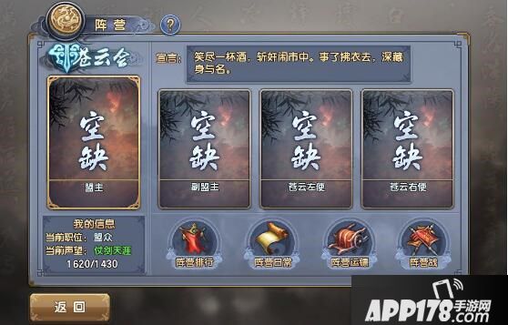 每周帮派战之后即可选定阵营职位,帮派中本阵营排位最高的帮派帮主,为本阵营本周盟主,排名第二的帮派帮主成为本阵营的副帮主,阵营声望榜及杀人榜第一的玩家将成为本周阵营左使和右使