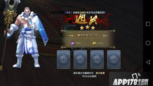 第一次:因为我当时战力是副本推荐战力的2倍还多,进去直接挂机。看着我的和尚一个一个小关的过(任务提示了必须打死四角的怪物,BOSS才会现身)。时间到了我才刚刚打死第四个角落的小怪,不用说副本结束我是个两星。