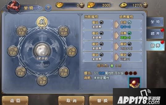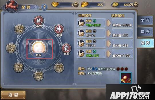 坐骑培养按等级开放相应的槽位,刷新的属性按颜色分为至尊>无双>至高>登峰>玄妙>纯青>基础,四种属性刷满三种一样颜色品质的即可升阶,升阶后更容易刷新到高品质的属性哦