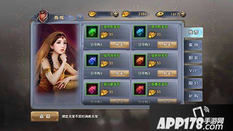 除了翻牌时可以用到外,绑定元宝在商城中的作用也是非常多的。在右上角点击商城进入后,可以看到在推荐栏中,除了战力礼包外,下面的宝石都是可以用绑定元宝购买的。除此之外,在常用的道具比如还魂丹、行镖旗以及一些显示装备碎片都是可以用绑定元宝购买的。
