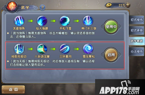 在新手阶段结束后,玩家就可以集齐并启用此类武学套路。