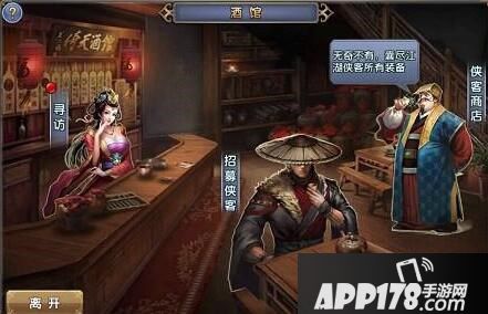 酒馆中三个人物分别代表了侠客寻访、侠客招募和侠客商店。