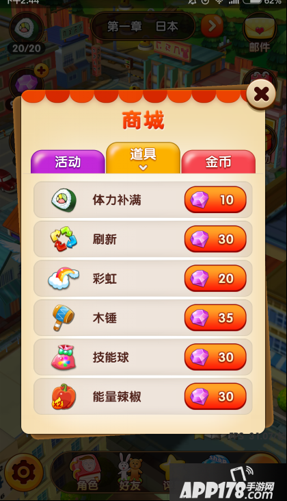 《樱桃小丸子》手游中设立了非常好用的商店,玩家可以通过商店买到各种方便实用的道具,以及体力值的补充,玩家在体力耗尽的时候,只需10钻石就可以将体力补满了哟。