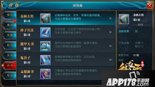 目前一共有《春秋左传》、《孙子兵法》、《遁甲天书》、《鬼谷子》、《孟德新书》五部兵书,皆是春秋战国时期以及三国时代著名的兵法著作。每部兵书对属性的提升侧重点也不同,《春秋左传》以增加力量属性为主,《孙子兵法》以增加智力属性为主,《遁甲天书》增加敏捷属性,《鬼谷子》增加精神属性,《孟德新书》增加体质属性。