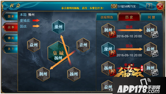9月9日晚,由于首次皇城战扬州遗憾惜败,二次皇城战空城获胜后,荆州对扬州发起国战,而与此同时,豫州虽国力垫底,但本国团结一心,发起了对益州的国战,本以为是一场艰辛的战斗,却因为荆州国力的跌落成弱国再度联盟,而青益两国联盟却受系统限制被强制解盟,因此10日晚,豫荆联盟共有两场国战同时进行。