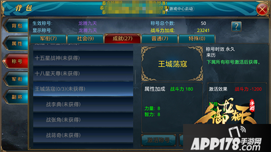 回归正题,王城的四个称号分别为:王城荡寇、战李典、战张角、战蒋奇。这几个称号就要比卧龙城的属性有所提升了。