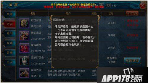 2,族长可以在家族活动管理界面中界面中设置这个活动开启的时间和难度,难度越大,获得的奖励越好。